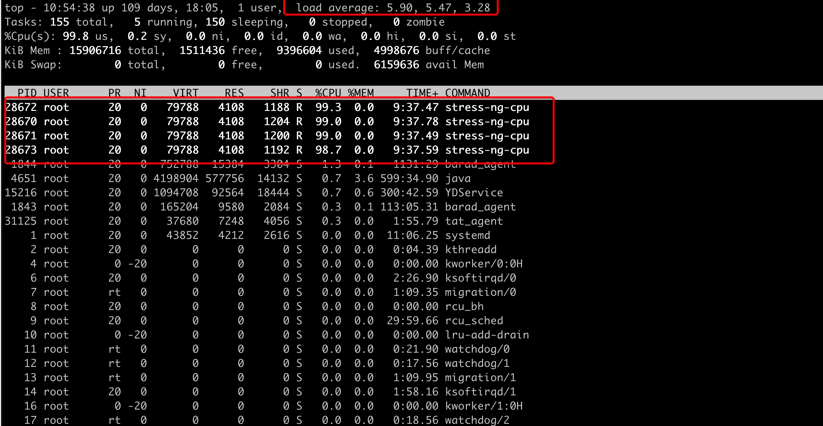使用 ssh 登录服务器执行 Top 命令,查看产生了 4 个 stress-ng-cpu 进程(服务器的 CPU 规格为 4 核),CPU 的负载分别达到 5.90 5.47 3.28,说明故障注入已生效。