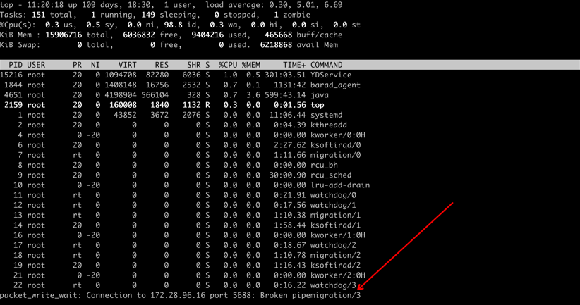等待执行完成后,我们连接这台服务器的 ssh 会话自动退出,说明故障注入已生效。